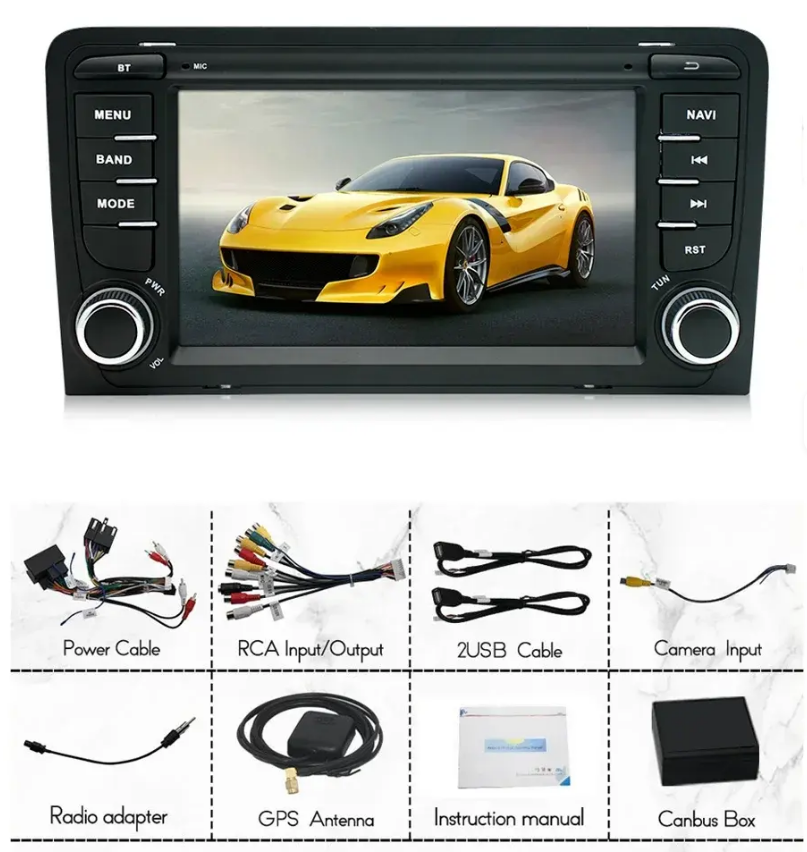 Android 13 / CARPLAY pour AUDI A3 2003-2012 Quad Core 2Go RAM + 32Go ROM Écran Tactile Supporte GPS / Radio FM / WiFi / Bluetooth Commandes au Volant Cadre + Câbles